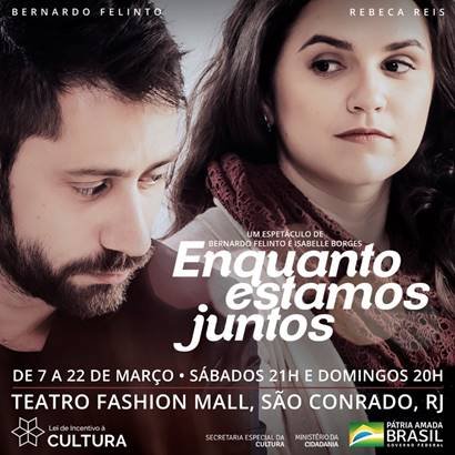 Depois da estreia, em Brasília, o espetáculo ´Enquanto estamos juntos´ faz curta temporada no Rio, no teatro Fashion Mall, em São Conrado, de 07 a 22 de março,  sábados, às 21h, e domingos, às 20h. No elenco, a atriz Rebeca Reis e o ator e diretor Bernardo Felinto, que assina o roteiro, ao lado de Isabelle Borges.