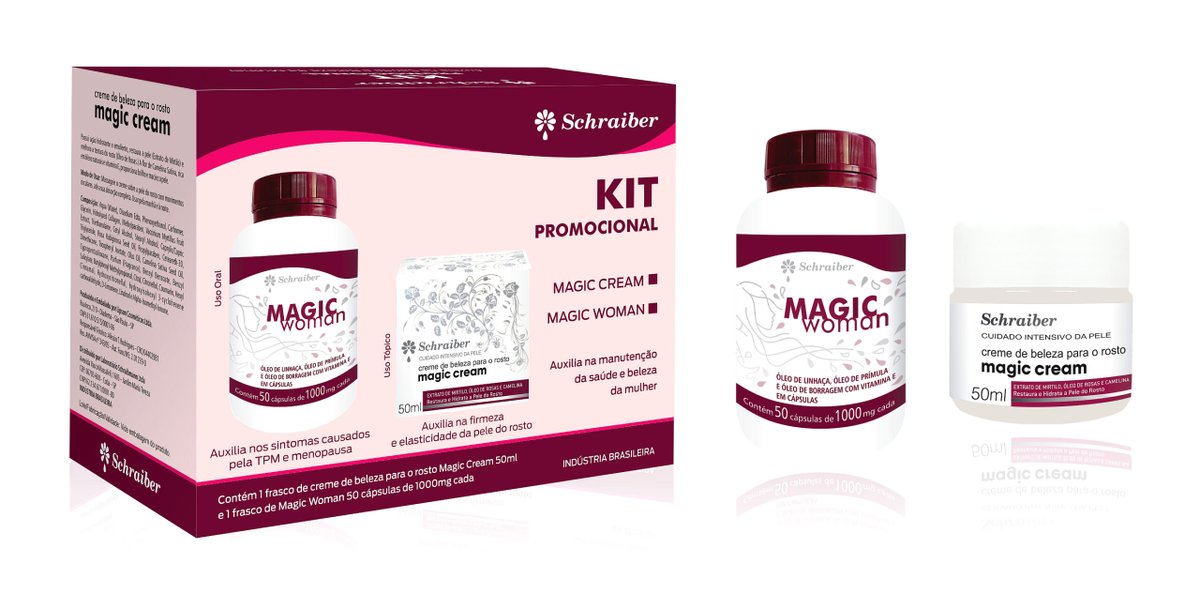 Já o Magic Woman é composto por óleo de linhaça, substância rica em Ômega 3, que protege o coração e vasos sanguíneos, além de melhorar a elasticidade das artérias e a irrigação sanguínea. Também possui ação antioxidante, diminuindo o envelhecimento precoce. O produto também contém óleo de prímula, responsável por manter a estrutura celular em bom funcionamento, aliviando os sintomas causados pela TPM e contribuindo para uma pele saudável e bem tratada. Por fim, o óleo de borragem colabora para tornar a pele mais suave, flexível e resistente.