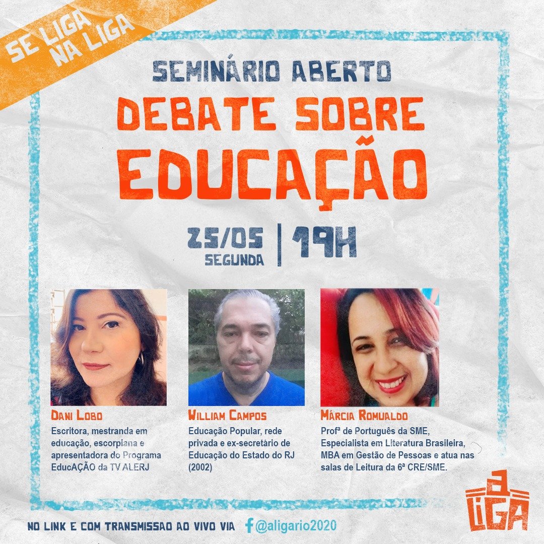 Nesta segunda, dia 25/05, a partir das 19h, o grupo de ativistas ‘A Liga’ realiza o seminário aberto sob o tema ‘Educação’. O debate terá a participação de especialistas na área de educação como Dani Lobo, William Campos e Márcia Romualdo. Durante o fórum serão tratados assuntos de interesse de toda sociedade como: Enem, EaD (Ensino a Distância), coronavírus, além da situação atual da educação no Rio de Janeiro. O encontro será transmitido ao vivo na plataforma de Facebook @aligario2020