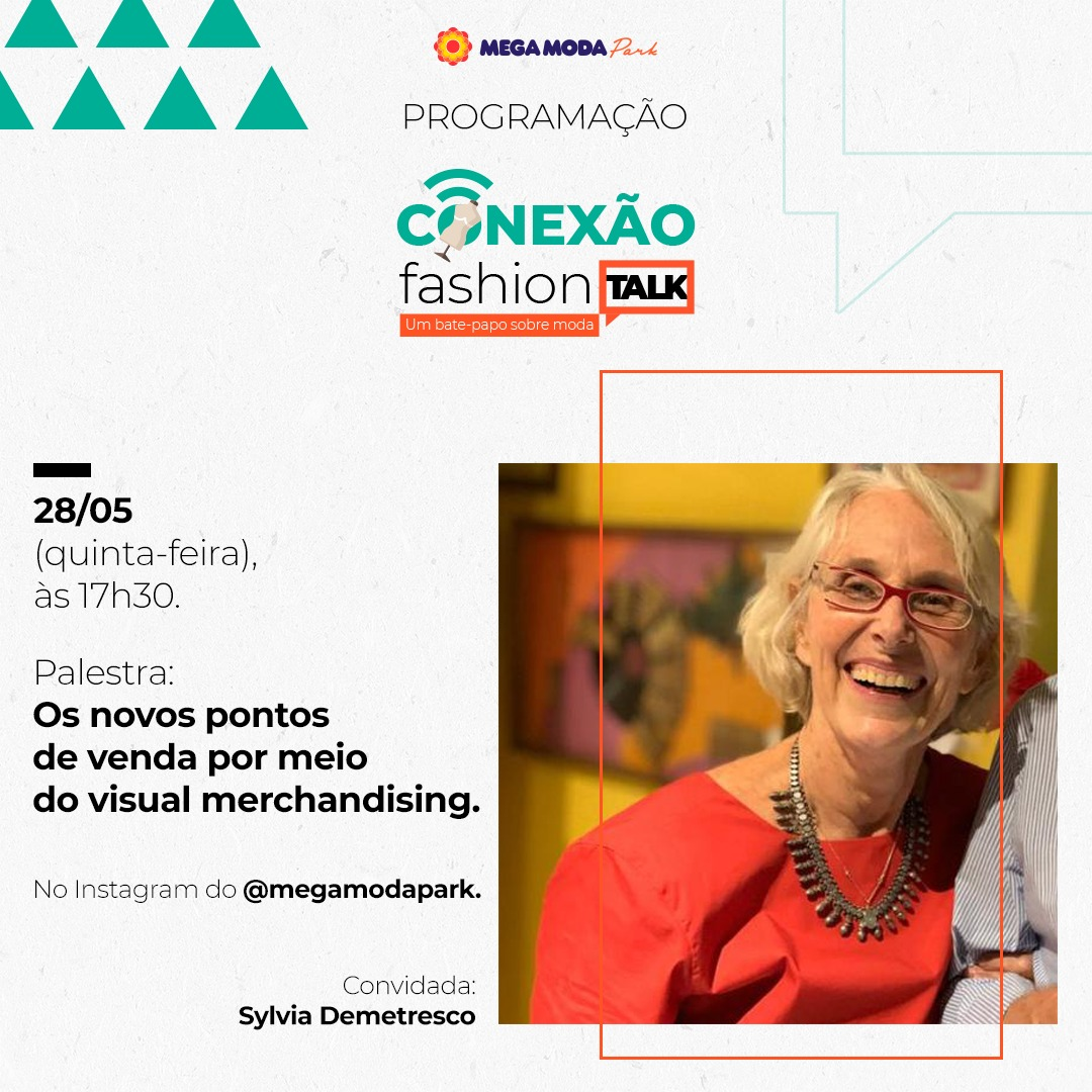 No  dia 28 de maio, às 17h30, acontecerá mais uma Live do projeto Conexão Fashion Talk, com transmissão ao vivo pelo o Instagram do @megamodapark. O tema “Os novos pontos de venda por meio do visual merchandising” será discutido por Sylvia Demetresco, doutora em visual merchandising, escritora e professora acadêmica.