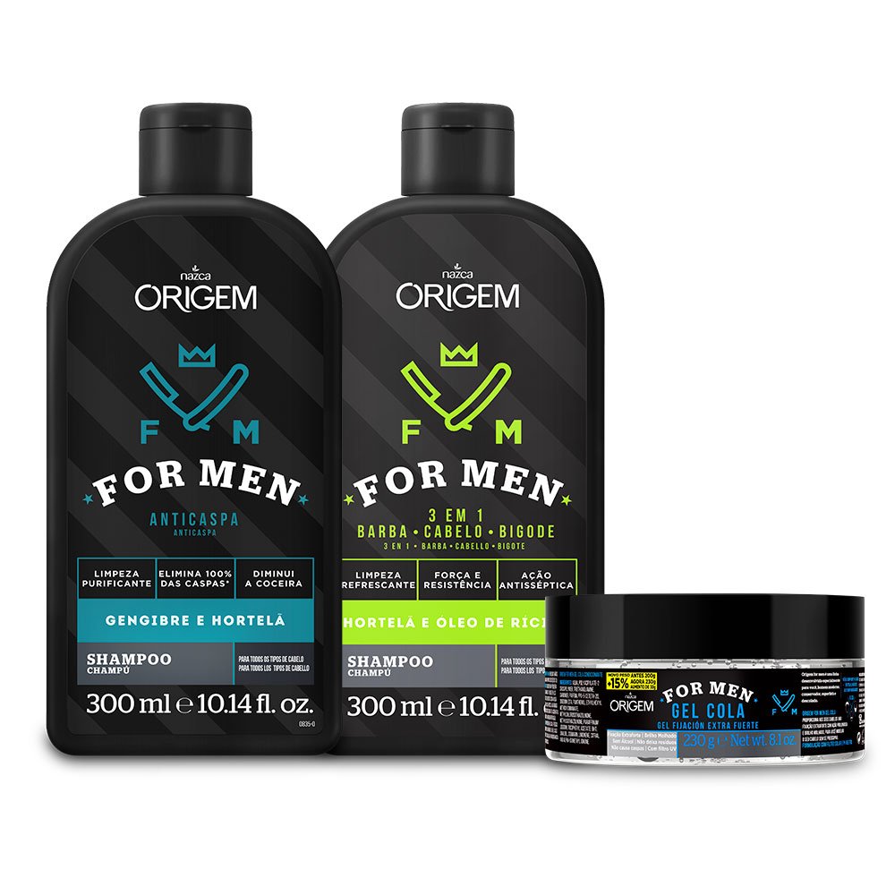 Voltada ao público masculino e inspirada em barbearia, a Nazca conta com a linha For Men. Os kits atendem aos mais variados estilos de homem e tipos de cabelo. São inúmeras opções, como shampoo para controle de queda capilar, anticaspa e ação 3 em 1 (para barba, cabelo e bigode), gel cola e pomadas de efeito brilho e efeito matte.
