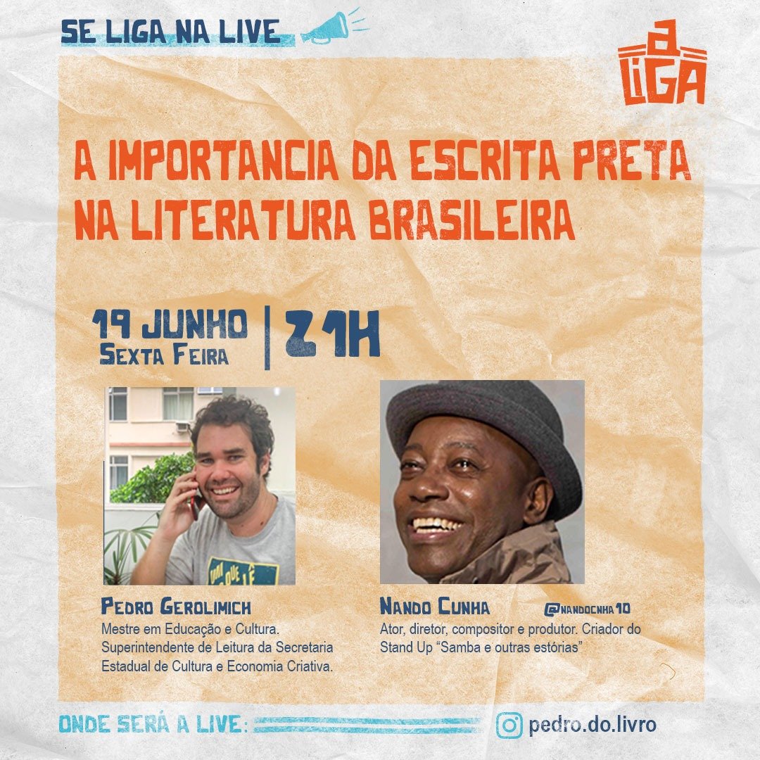 Nesta sexta-feira, 19 de junho, às 21h, o Superintendente de Leitura da Secretaria do Rio, Pedro Gerolimich, bate papo com o ator Nando Cunha sobre a importância da escrita preta na literatura brasileira. A live acontece no Instagram @pedrodolivro.
