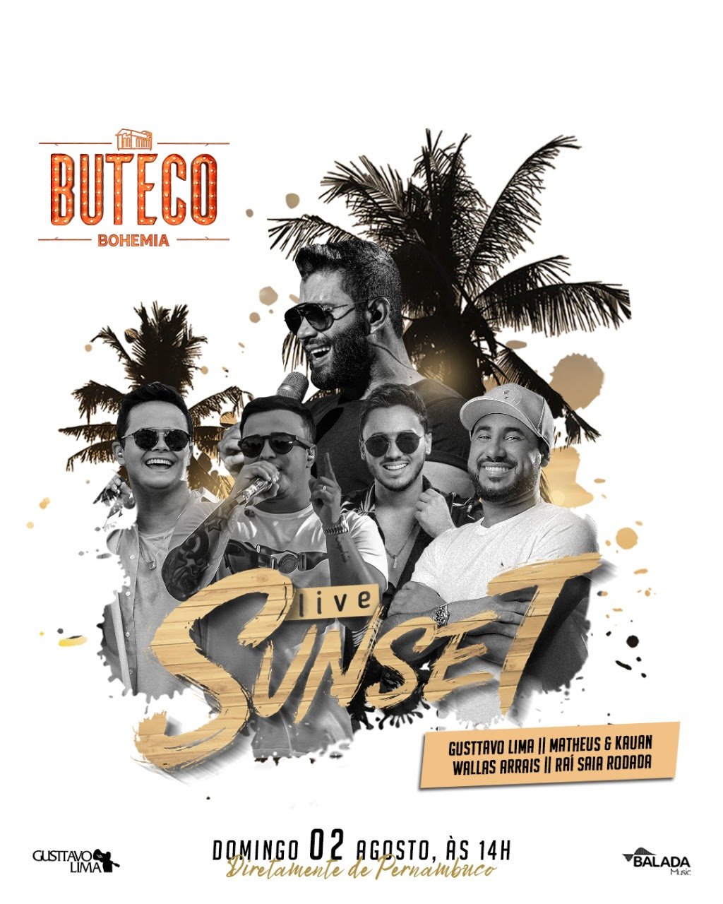 O cantor Gusttavo Lima está convocando um time de peso da música sertaneja e do forró para a realização de sua quinta live no YouTube, que está marcada para o próximo dia 02 de agosto, a partir das 14h. Além dos sucessos do Embaixador, o público irá curtir as apresentações de Matheus & Kauan, Rai Saia Rodada e Wallas Arrais. O #ButecoBohemiaSunset acontecerá em um cenário totalmente diferente e será transmitido diretamente de Pernambuco.