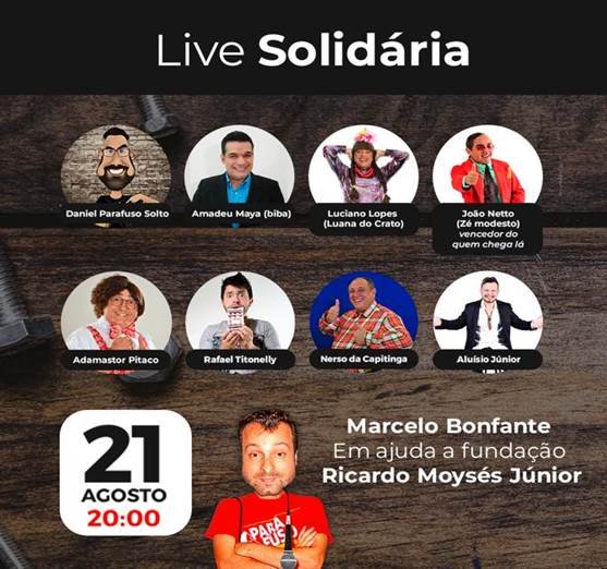 No dia 21 de agosto(sexta-feira) Marcelo Bonfante realiza sua primeira live em apoio a Fundação Ricardo Moyses Junior, que trata crianças com câncer. A live contará com a participação de grandes nomes do humor como Adamastor Pitaco, Nerso da Capitinga, Aluíso Junior, Zé Modesto, entre outros. A transmissão será às 20h, no canal oficial do humorista, YouTube (/MarceloParafusoSolto).