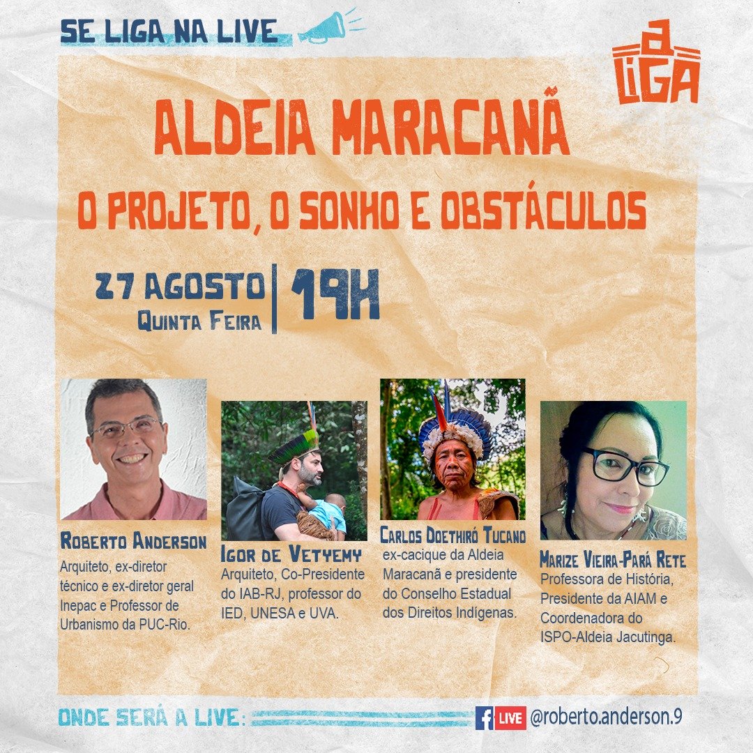 Na quinta-feira, 27, às 19h, os ativistas sociais do Coletivo A Liga, batem papo sobre A Aldeia Maracanã e sua importância histórica. A roda de conversa conta com a participação de Carlos Doethiró Tucano, ex-cacique da Aldeia Maracanã e presidente do Conselho Estadual dos Direitos Indígenas, Igor de Vetyemy, arquiteto e urbanista e Marize Vieira-Pará Rete, professora de história. A transmissão ao vivo acontece no Facebook @aligario2020.