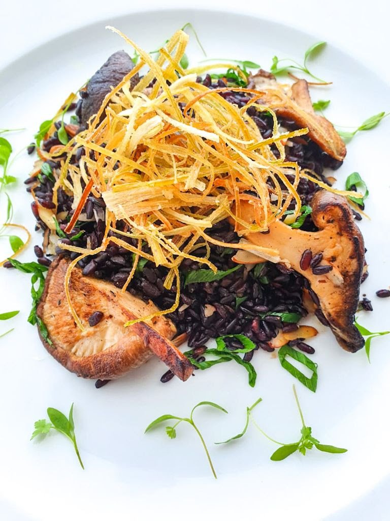 Principal: Arroz negro com amêndoas , cogumelos salteados e crispy de poró (R$ 67);