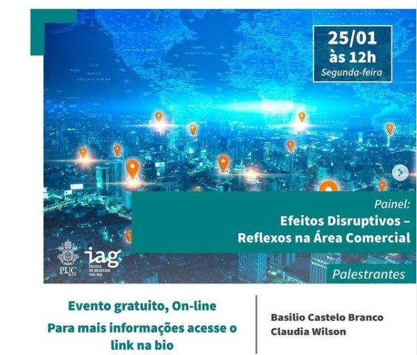 O IAG – Escola de Negócios da PUC-Rio promove, no dia 25 de janeiro (segunda-feira), ao meio dia, o painel Efeitos Disruptivos – Reflexos na área comercial, voltado para dirigentes de empresas, gestores e profissionais da área comercial. O encontro é online e gratuito.