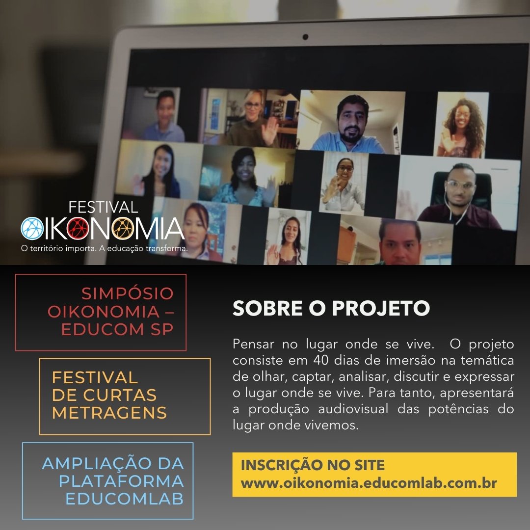 Já estão abertas as inscrições para a 1ª edição do Festival Oikonomia – Educom SP, realizado 100% online e com participação gratuita. O projeto consiste em 40 dias de imersão total em temas como economia criativa, educomunicação e cultura. A programação está composta por três ações principais: o Simpósio Oikonomia – Educom SP,que acontecerá entre os dias 28 e 30 de abril, um Festival de Curtas-Metragens, com recebimento de produções até o dia 20 de abril, e a Ampliação da Plataforma Educomlab, a qual hoje disponibiliza um módulo de formação em educomunicação – linguagem audiovisual, composto de 8 videoaulas com certificação e que, em breve, oferecerá mentorias voltadas também para economia criativa e empreendedorismo.