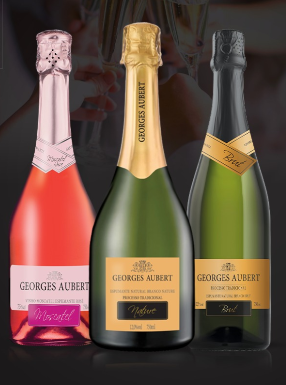 Georges Aubert Nature – É o mais seco dos espumantes, mantendo o mínimo de açúcar residual de 0 a 1g/litro). O Georges Aubert Nature é produzido com uvas Chardonnay e Pinot Noir com método tradicional, em que a segunda fermentação que forma as bolhas acontece na própria garrafa. A bebida tem sabor fresco e ao mesmo tempo encorpado, com aroma intenso e complexo, e retrogosto que combina notas de maçã verde, amêndoas, pêssego, nozes, florais e pimenta branca. Temperatura sugerida de serviço: 6ºC a 8ºC.