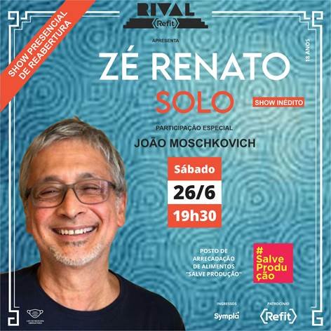 A notícia é boa e fica ainda melhor quando a gente fica sabendo que o convidado para essa reabertura, no próximo dia 26, é Zé Renato, que vai apresentar um show intimista ao lado apenas do filho, o guitarrista João Moschkovich. E, claro, o Teatro Rival Refit vai seguir todos os protocolos de segurança, com apenas 40% da lotação da casa, uso obrigatório de máscara, distanciamento entre as mesas, dispensers de álcool em gel espalhados pela casa e aferição de temperatura na entrada. Além do mais, o teatro montou um posto de arrecadação de alimentos não perecíveis em parceria com a campanha Salve Produção. Assim, quem for se divertir também pode ajudar aos profissionais do setor de entretenimento. Afinal, a resistência cultural é coletiva.