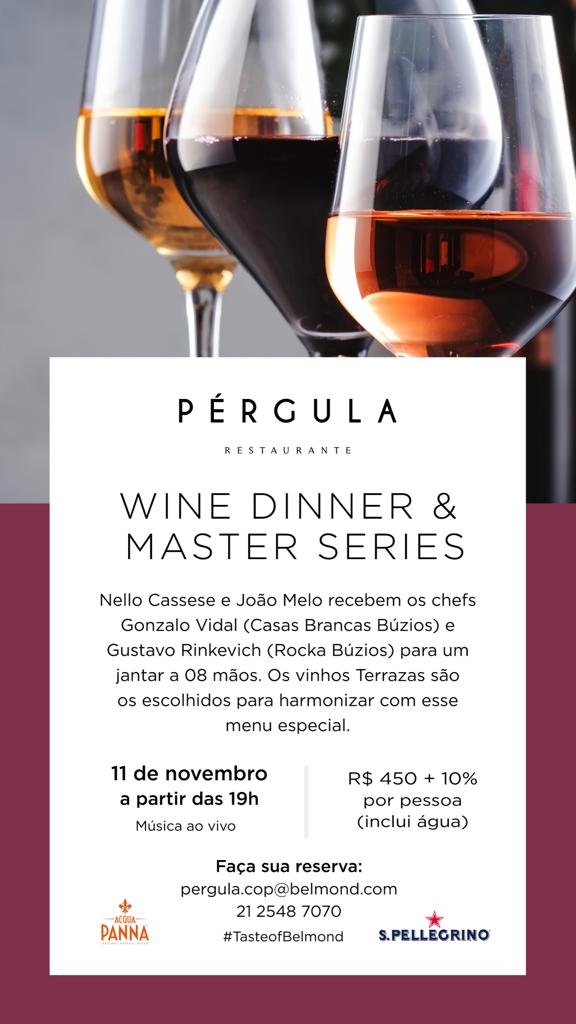 Na sexta-feira, dia 11 de novembro, o restaurante Pérgula, do Copacabana Palace, a Belmond Hotel, vai realizar um jantar harmonizado especial com vinhos argentinos da label Terraza, a partir das 19h. Idealizado especialmente para a ocasião, o menu contará com receitas exclusivas preparadas a oito mãos pelo chef da casa, João Melo, pelo chef executivo do hotel, Nello Cassese, em parceria com os chefs convidados Gonzalo Vidal, do Casas Brancas Búzios, e Gustavo Rinkevich, do Rocka Búzios.