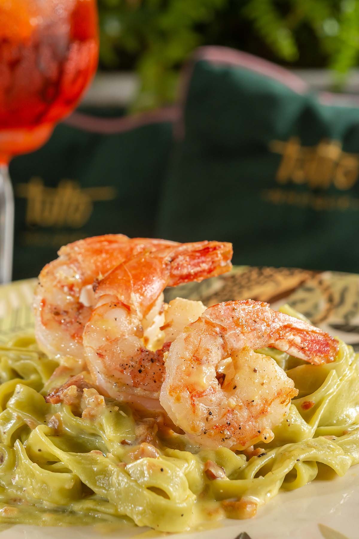 “A ideia foi trazer nossa pegada italiana, mas com aroma e cara de Brasil. O prato é uma junção da terra e mar, misturando o elemento suíno com o camarão. Uma verdadeira licença poética nossa para criarmos uma releitura do tradicional carbonara”, conta a chef Helena Murucci.
