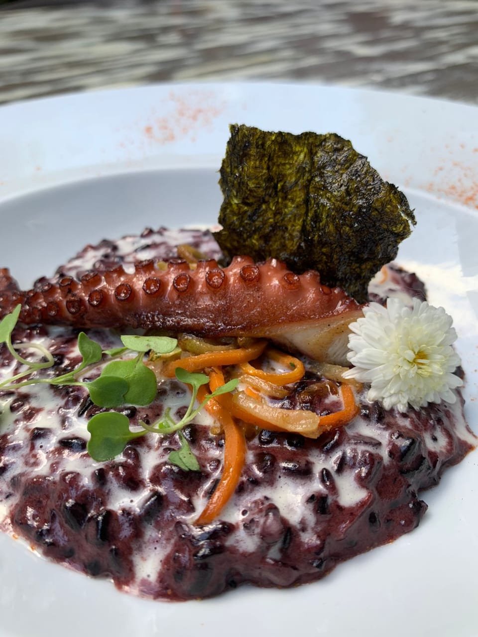 O primeiro prato será o Risoto nero com polvo, creme de burrata e flocos de castanhas do Pará acompanhado do Casa Mia Nerello Mascalese DOC, Itália.