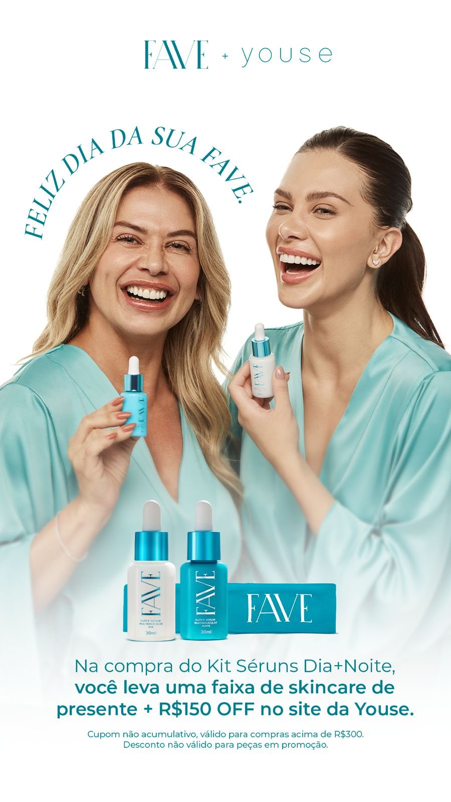 Outra artista-empresária atenta às tendências desta data é a atriz Flavia Pavanelli. Ela – que também é influenciadora digital sobre assuntos relacionados à estética – lançou há pouco sua própria linha de skincare, a FAVE, e, para o Dia das Mães, trouxe uma collab com a sua marca de roupas Youse. Quem comprar um kit com 2 unidades do Super Sérum Multimolecular (que tem as versões diurna e noturna), disponível no site faveskin.com.br, recebe ainda uma faixa de cabelo personalizada e um cupom de 150 reais de desconto para ser usado na Youse. As compras unitárias garantem um cupom de 50 reais na mesma loja.