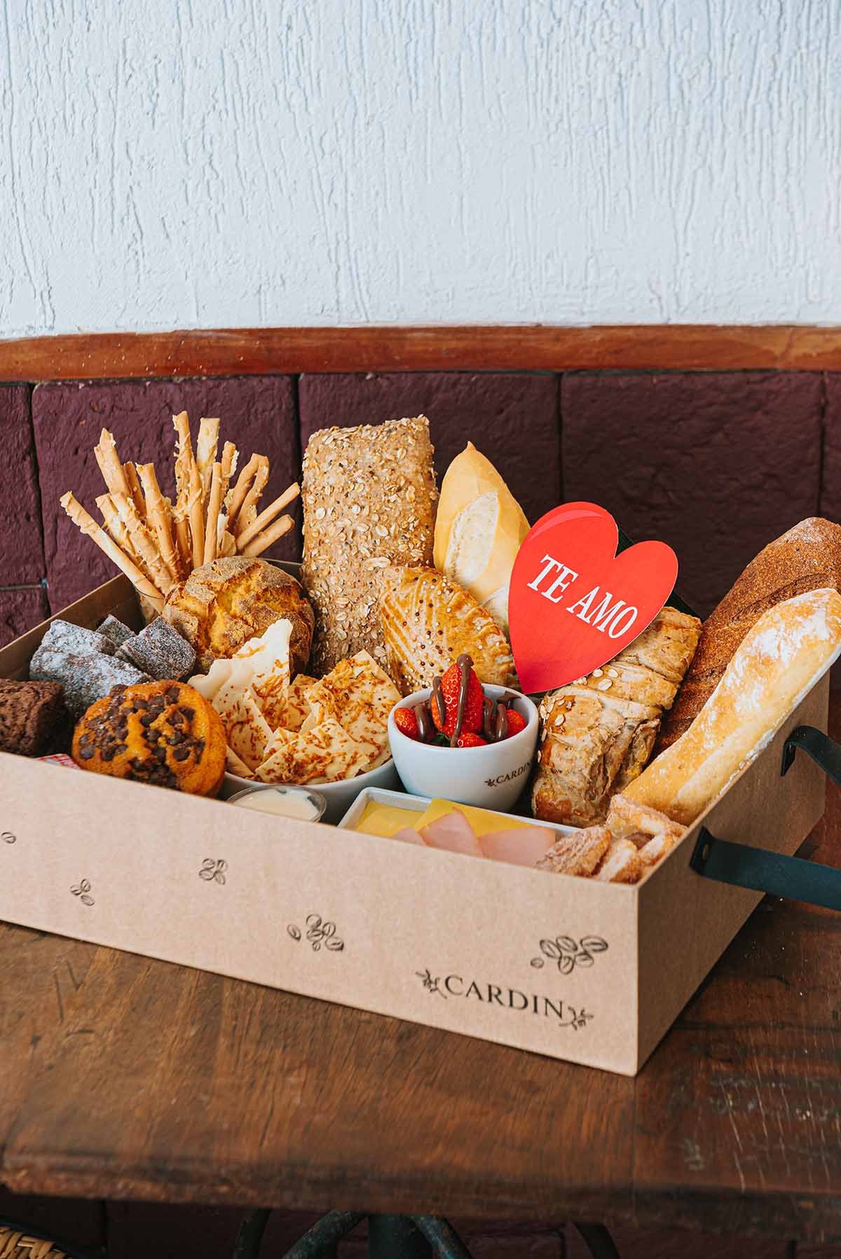 Dentre os itens inéditos, a Cesta de Café da Manhã dos Namorados (R$ 320) é perfeita! Ela inclui: 1 minibaguete de fermentação natural, 1 minibaguete tradicional, 1 ciabatta integral, 1 ciabatta tradicional, 1 croissant queijo e presunto, 1 broinha, 1 pacote de palitinhos de queijo (90g), 1 pacote de pizza branca (90g), 1 pacote de Palmier (90g), 1 fatia de bolo de cenoura com chocolate, 1 caixa de palha italiana, 1 brownie recheado com brigadeiro, 1 empanada integral, 1 porção de: morango com Nutella, peito de peru, queijo Gruyère, geleia, requeijão, manteiga e 2 Drip Coffee. Acompanha ainda coração escrito TE AMO. Para quem preferir, há a opção da Cesta com Caneca por R$ 353.