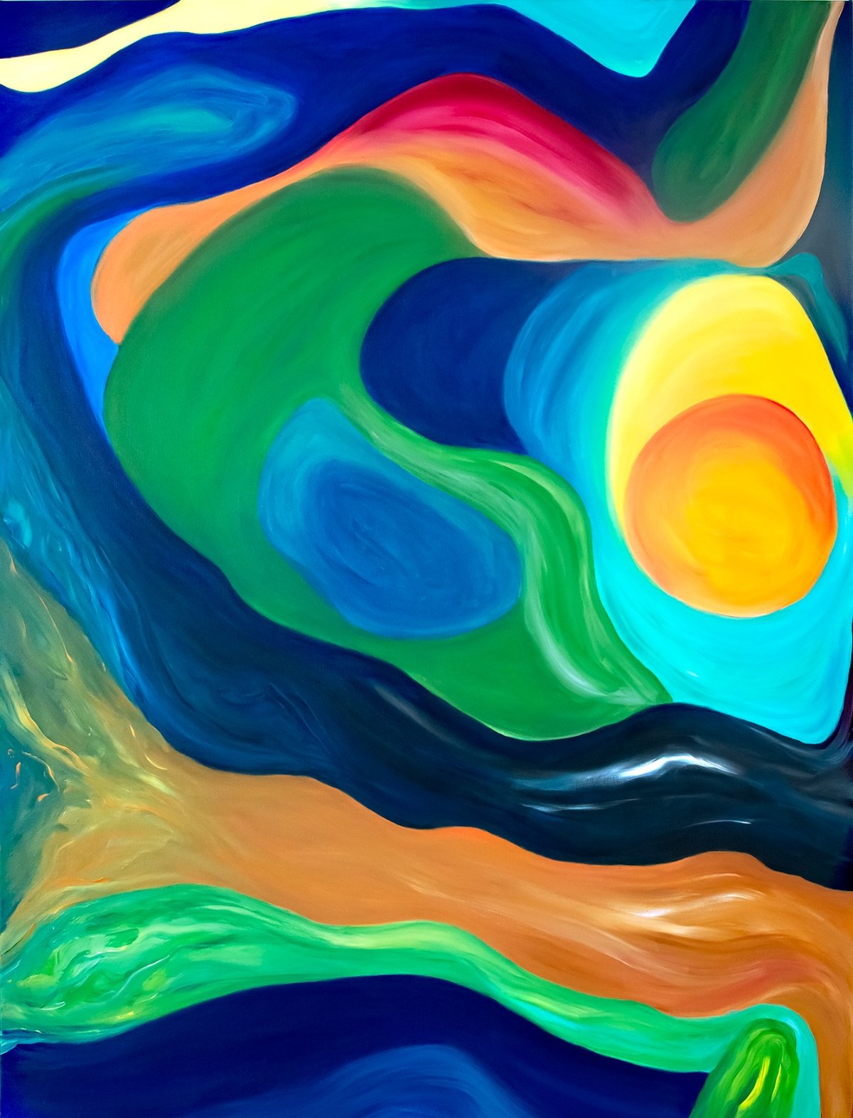 Nas telas, as pinceladas de Varella não se limitam à representação; elas ecoam o ritmo da própria natureza. Os movimentos sinuosos e circulares de sua técnica evocam a energia contínua da pororoca, esse confronto entre o rio e o oceano, traduzido em tonalidades terrosas e profundas que remetem à visceralidade do fenômeno. Já nas representações dos rios e suas margens, a explosão de cores expande o olhar para a riqueza de vida e a diversidade de paisagens que a Amazônia carrega em suas águas.