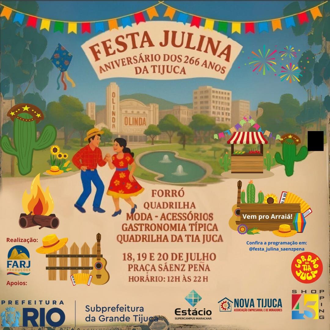 A Tijuca, um dos bairros mais tradicionais do Rio de Janeiro, comemora 266 anos com uma grande Festa Julina na Praça Saens Peña, entre os dias 18 e 20 de julho. O evento, que acontece das 12h às 22h, reúne cultura popular, gastronomia típica e atrações para toda a família, com entrada gratuita.
