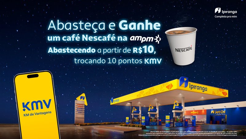 A Ipiranga anunciou uma nova promoção válida em todo o Brasil: até o dia 31 de julho, clientes que abastecerem nos postos participantes e pagarem usando o aplicativo do programa de fidelidade KMV poderão trocar 10 pontos acumulados por uma bebida cremosa Nescafé nas lojas AmPm. A ação oferece até cinco vouchers por CPF, limitados ao período da campanha.