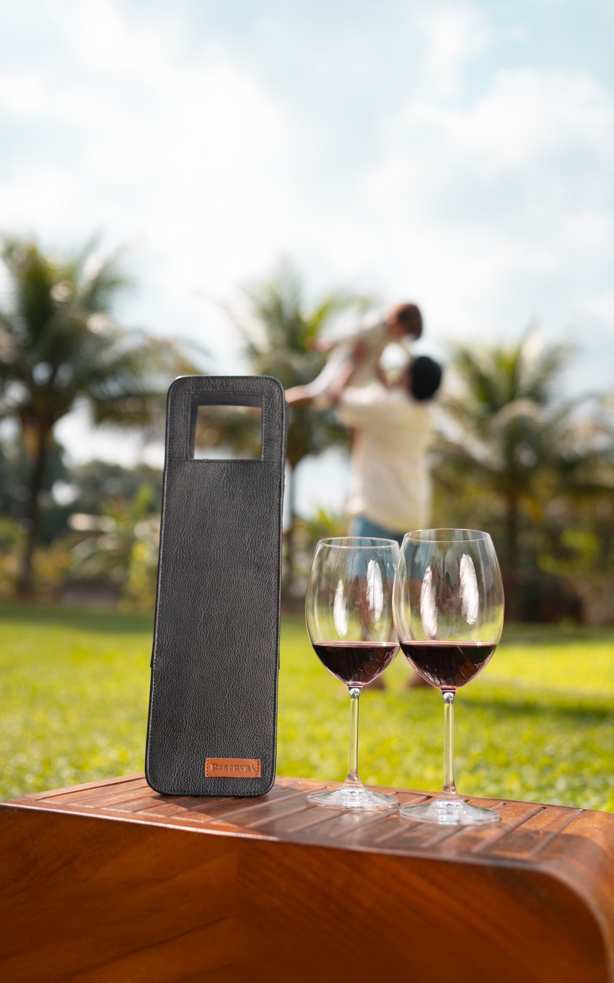 O porta-vinho Reserva para RIOSUL é uma peça individual em couro, projetada para unir design sofisticado e funcionalidade, ideal para quem aprecia momentos marcantes com elegância.
