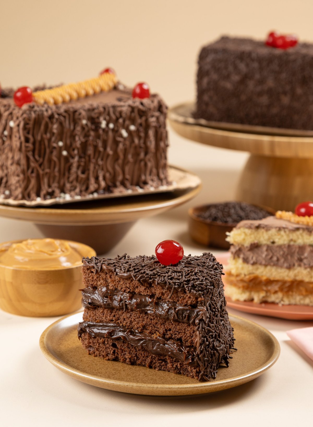 • #07 Brigadeiro Tradicional: massa de chocolate, recheio de brigadeiro, cobertura de trufado ao leite, granulado e cerejas decorativas.