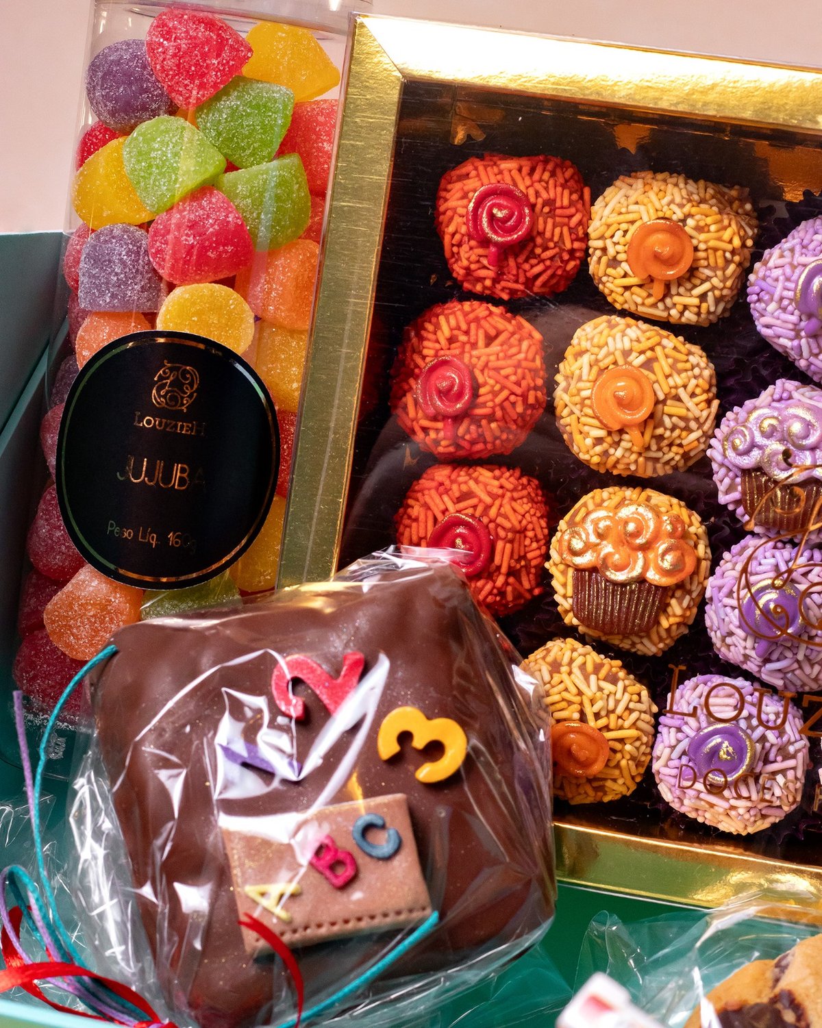 Além do momento lúdico, a caixa guarda um verdadeiro tesouro de doces: jujubas, confetes, uma caixa com 16 mini brigadeiros temáticos, puxa de amendoim e cookie com brigadeiro.