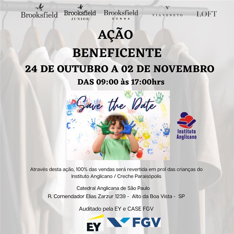 Entre os dias 24 de outubro e 2 de novembro, a Catedral Anglicana de São Paulo recebe a Ação Beneficente da Brooksfield, evento que une as marcas Brooksfield, Brooksfield Júnior, Donna, Via Veneto e Loft em uma iniciativa voltada ao impacto social.