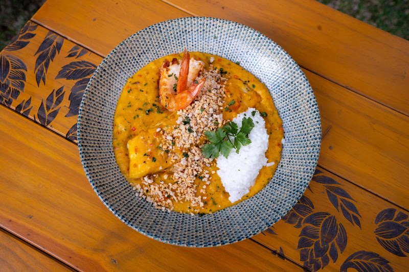 A criação da chef combina peixe grelhado e camarões ao bobó, com creme aveludado de mandioquinha, arroz ao leite de coco e uma farofa crocante de castanhas, traduzindo toda a riqueza de sabores do país.