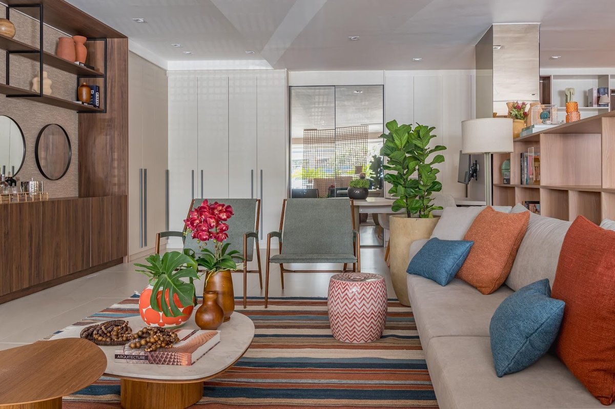 A dupla criou um ambiente que convida a sentir e desacelerar. A sala de TV e o quarto possuem base em tons neutros — beges, cinzas e cru —, com cores expressivas nos objetos e tecidos. “É a cor que traz personalidade ao espaço”, diz Andrea Duarte. Os tons terrosos, azuis e verdes integram-se naturalmente, complementados por plantas, que trazem frescor e movimento. “O resultado é um espaço que acolhe, inspira e transforma — um refúgio onde a simplicidade dos neutros se encontra com a alma das cores”, afirma Anna Malta.