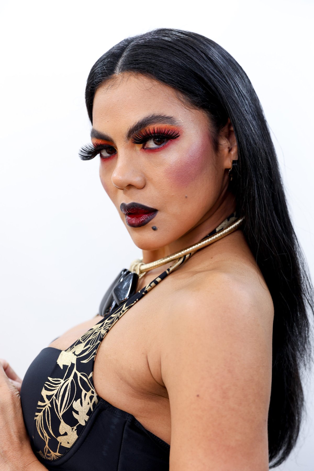 “Recebi o convite para ser a modelo dessa maquiagem com um entusiasmo imediato, principalmente ao descobrir que a proposta de Halloween seria uma releitura sofisticada, focada na elegância e no realce do meu tom de pele. Imediatamente, me reportei ao mundo da magia, bruxos e vampiros, trazendo uma beleza incendiária tendo no vermelho a marca da sedução, intensificando suas características marcantes. E foi essa essência poderosa que me inspirou e que quisermos colocar nessa make.”Equipe e finalização