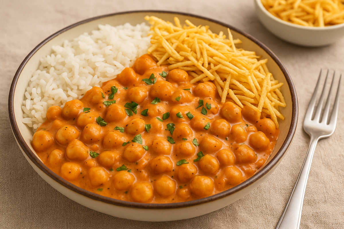 Ingredientes (4 porções):2 xícaras de grão-de-bico cozido1 cebola picada2 dentes de alho amassados1 xícara de molho de tomate1/2 xícara de creme de leite ou versão vegetal1 colher (sopa) de mostardaSal, pimenta e salsinha a gosto