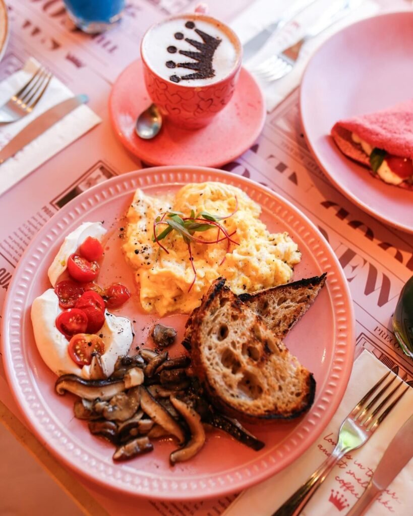 No Café Cherie, a Breakfast Box é uma das escolhas mais pedidas. O prato reúne ovos mexidos cremosos, tomatinhos confitados, cogumelos salteados, creme de ricota e pão levain artesanal, criando um equilíbrio entre proteína, frescor e textura.