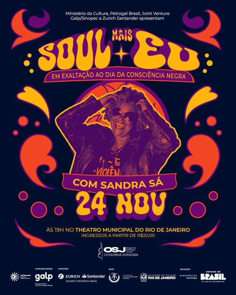 A cantora Sandra Sá é a convidada especial do concerto Soul Mais Eu – Exaltação ao Dia da Consciência Negra, que será apresentado pela Orquestra Sinfônica Juvenil Chiquinha Gonzaga no dia 24 de novembro, no Theatro Municipal do Rio de Janeiro. O evento celebra a resistência e a luta do povo negro por uma sociedade mais justa e igualitária. O projeto conta com patrocínio master da Petrogal Brasil, joint-venture Galp/Sinopec, e patrocínio da Zurich Santander, por meio da Lei Federal de Incentivo à Cultura, além do apoio do Theatro Municipal e da Secretaria de Estado de Cultura e Economia Criativa do Rio.