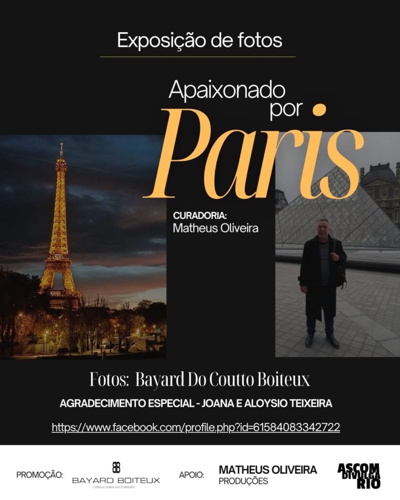 Bayard Boiteux se declara um apaixonado por clics e fotos. Ele não se considera um fotógrafo profissional. No entanto, é um amante por novas percepções. Dessa forma, ele busca uma visão diferente da arte de fotografar.A exposição virtual sobre Paris tem curadoria de Matheus Oliveira. Boiteux busca entender a Cidade Luz. Ele destaca as manifestações arquitetônicas. Por fim, o projeto inclui alguns ícones que definem a beleza de Paris.