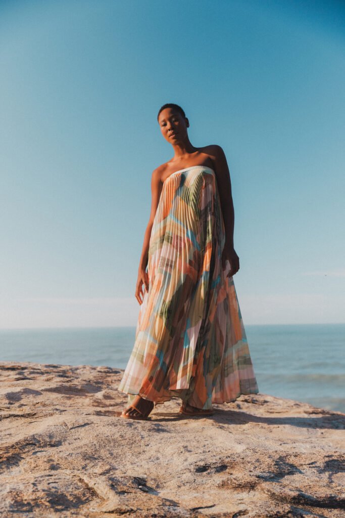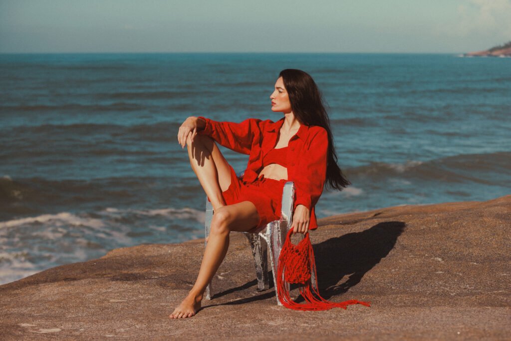 O azul-céu surge como ponto de cor suave e marcante, equilibrando as nuances quentes. Assim, as combinações permitem looks que vão do pós-praia aos encontros urbanos. A proposta é acompanhar diferentes momentos do dia com frescor.