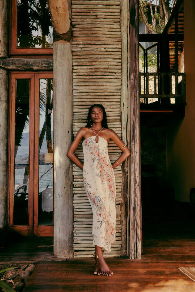 Entre os destaques estão vestidos fluidos e shapes esvoaçantes, linho fresco, tule estampado e bordado richelieu artesanal. As estampas autorais trazem maxiflores, folhagens e pássaros, reforçando a atmosfera tropical. A proposta visual dialoga com um guarda-roupa de estética resort e clima de férias.