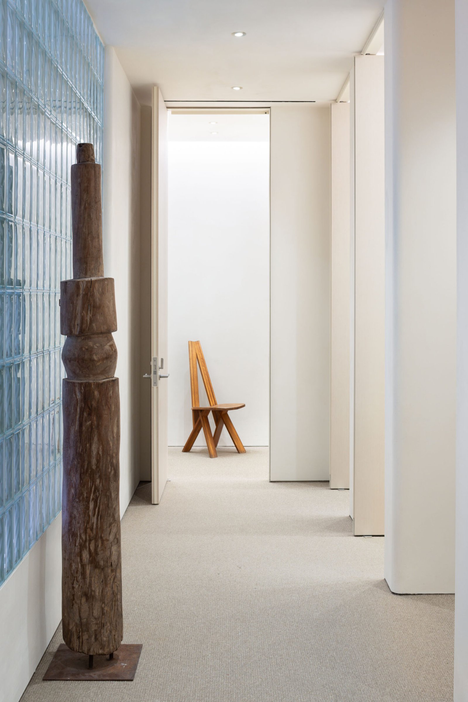 Inside, a palette of creams, warm neutrals and natural textures — a Calvin Klein hallmark — creates a serene backdrop. The open space blends authentic industrial character with a refined sensibility. Exposed wood-beam ceilings, molded columns and concrete floors reference the raw look of classic SoHo lofts.