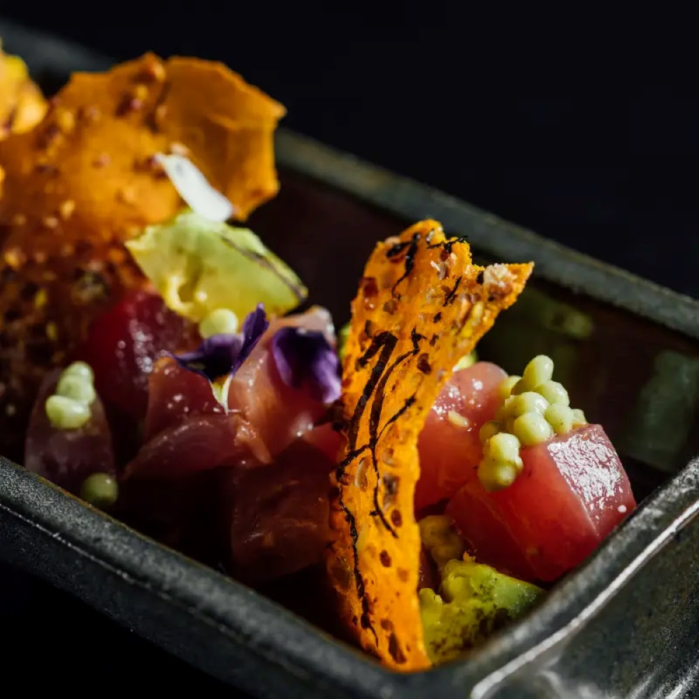 O Ceviche de Atum traz atum, abacate, caviar wasabi e nori ao molho ponzu, finalizado com crocante andino. A combinação destaca gordura, picância e umami em harmonia. Dessa forma, o preparo evidencia a técnica da cozinha nikkei na montagem de camadas de sabor.