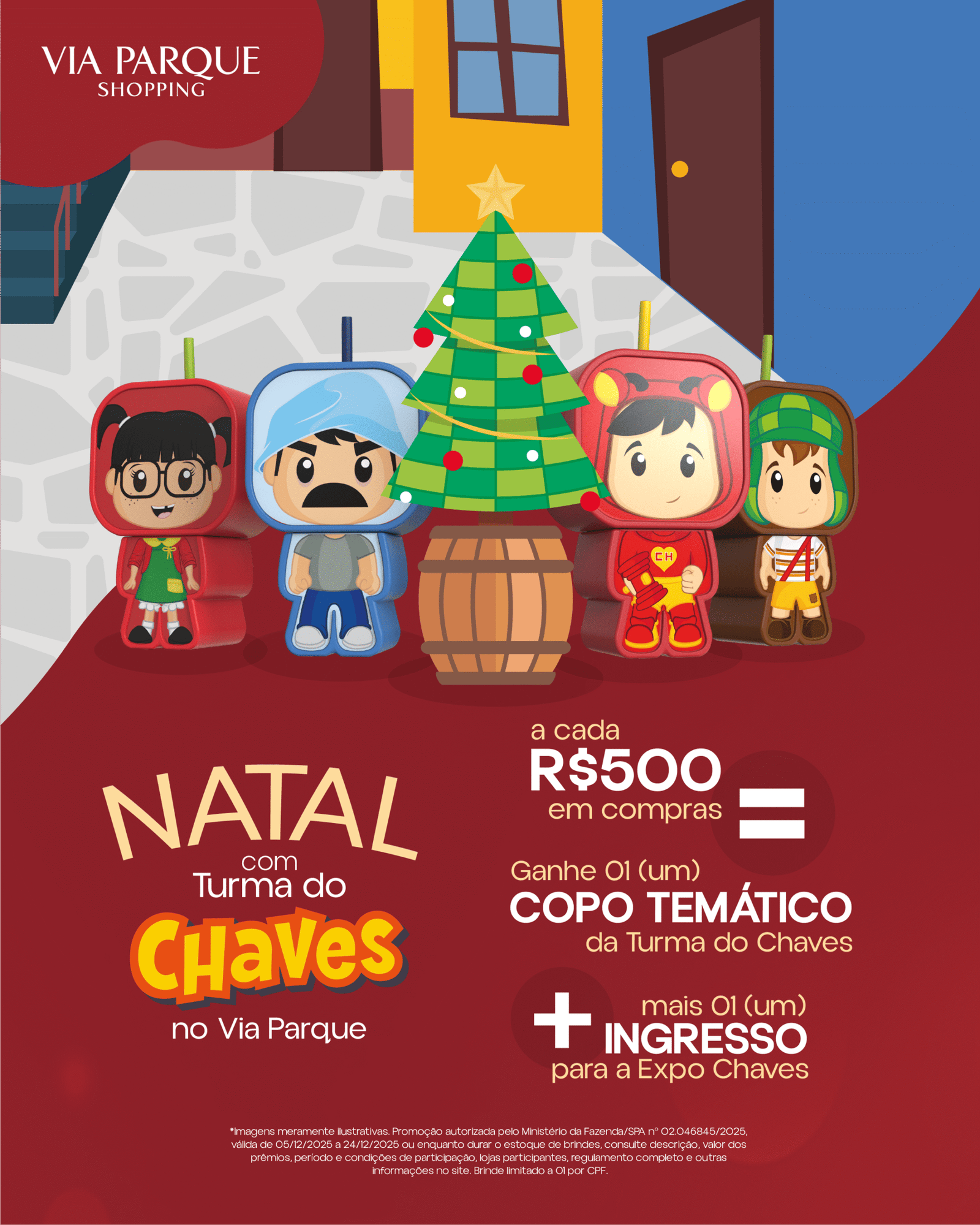 O Via Parque Shopping lançou uma promoção especial de Natal que promete transformar as compras de fim de ano em uma experiência completa para toda a família. A campanha Casa do Noel oferece um copo temático exclusivo da Turma do Chaves e um ingresso para Chaves – A Exposição.