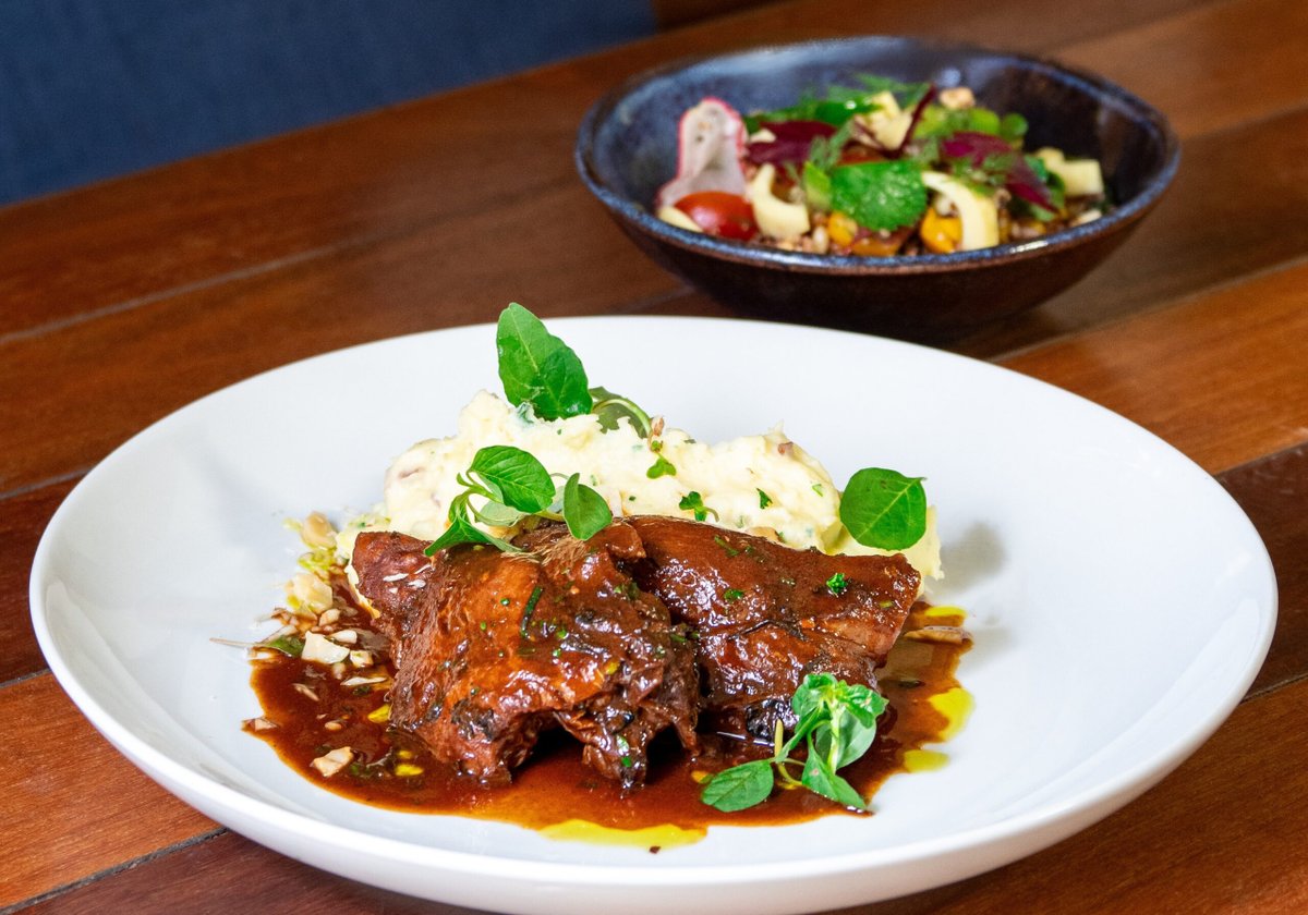 O menu de Natal tem como protagonista o pernil de vitelo assado com molho roti. A carne é servida com salada de grãos nativos e legumes, que traz textura e brasilidade ao prato. O acompanhamento reforça a ideia de celebrar ingredientes do território nacional.