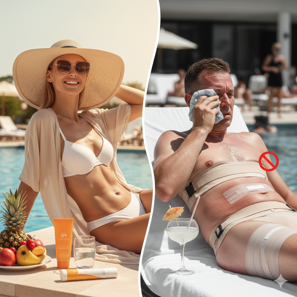 A exposição solar inadequada no pós-operatório está entre os maiores riscos do verão. O sol pode provocar manchas definitivas e comprometer cicatrizes. Além disso, pode atrasar a recuperação.