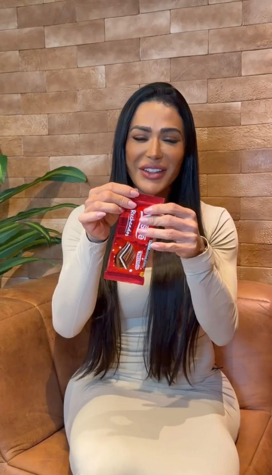 Um ano após cena do BBB2025, Gracyanne Barbosa volta a comer chocolate em ação da Nestlé e prova os novos tabletes Nestlé Recheados.