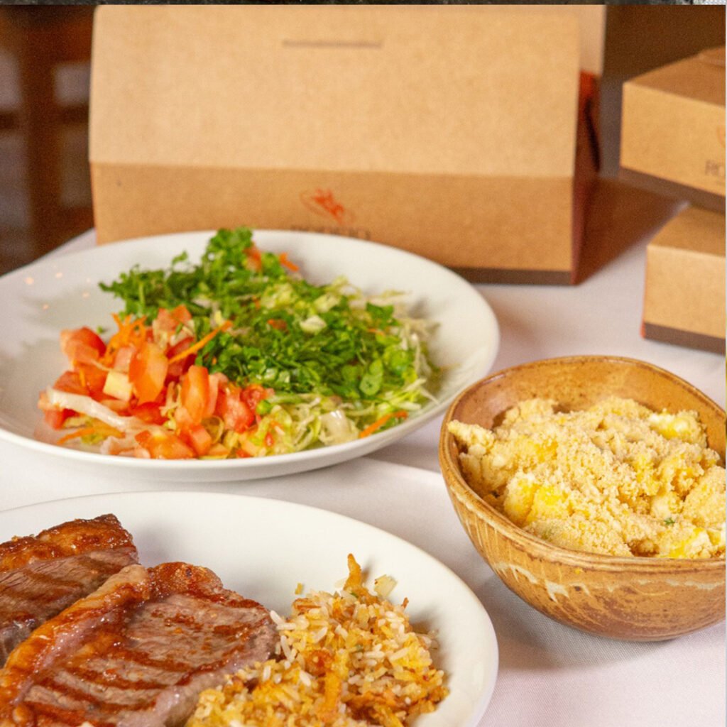 Her personal order is the full Juliana salad. In addition, she points to egg farofa, biro-biro rice, and the house specialty, sliced picanha. Finally, she praises the corn cream and the papaya cream.