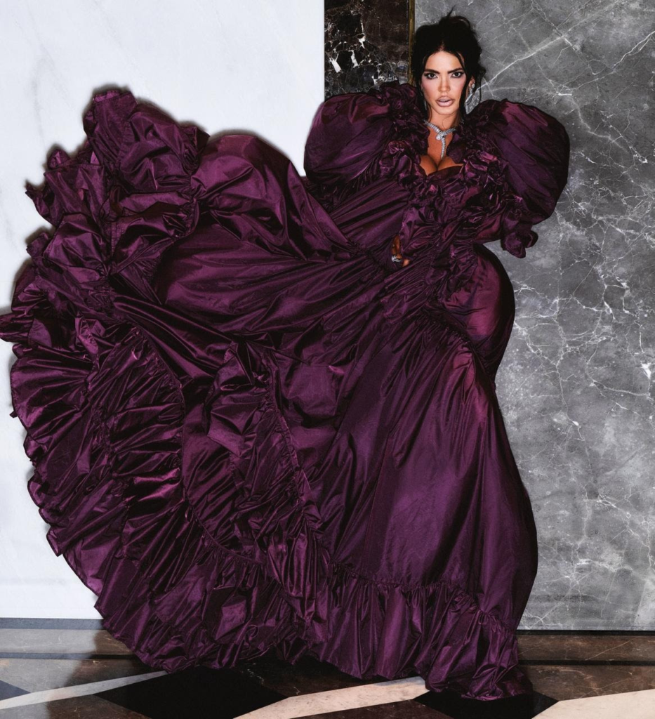 Em tom bordô profundo, o modelo se destacou pelo volume escultural nos ombros e mangas. Dessa forma, camadas de tecido leve e texturizado criaram movimento e dramaticidade na medida certa.