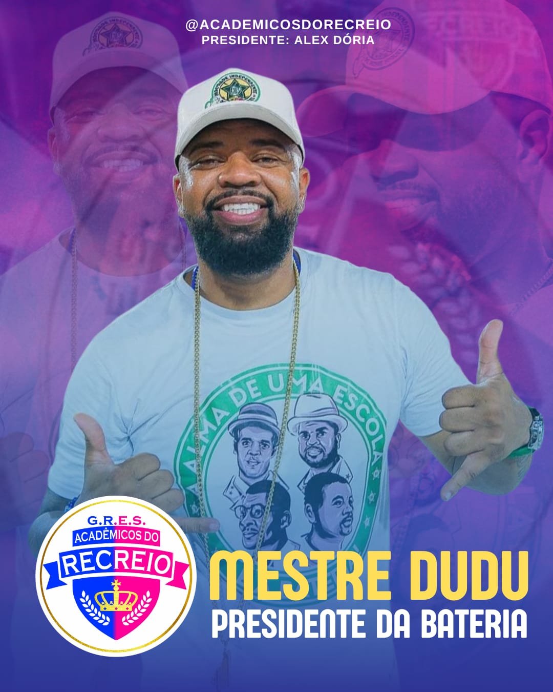 A Acadêmicos do Recreio anunciou a chegada de Mestre Dudu como presidente de bateria para o Carnaval 2026. Ele é o atual mestre de bateria da Mocidade Independente de Padre Miguel, conhecida como “Não Existe Mais Quente”.