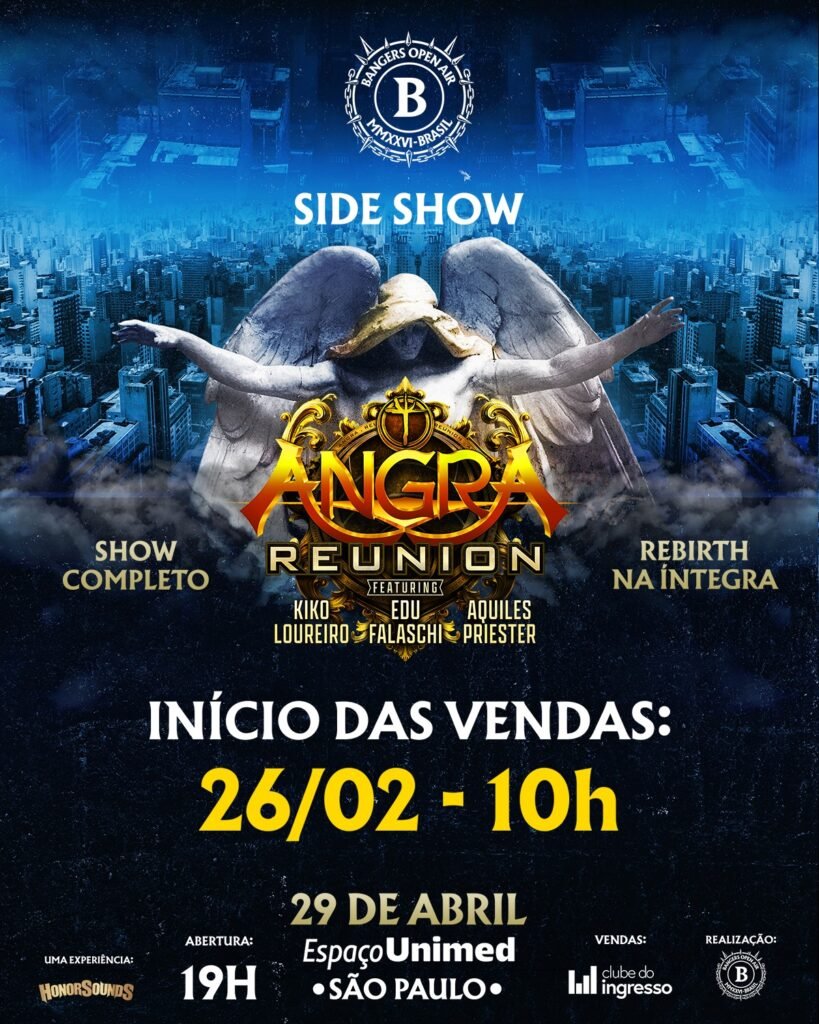 O Angra anuncia um show exclusivo no Espaço Unimed, em São Paulo, no dia 29 de abril de 2026. O evento celebra os 25 anos de Rebirth, álbum que marcou a trajetória da banda no heavy metal. Além disso, reúne pela primeira vez desde 2007 a formação “Nova Era”: Edu Falaschi, Kiko Loureiro, Rafael Bittencourt, Felipe Andreoli e Aquiles Priester.