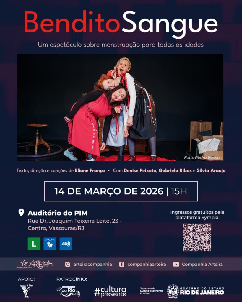 Companhia Arteira apresenta espetáculo “Bendito Sangue” e oficina de escrita neste sábado em Vassouras, com foco na menstruação.