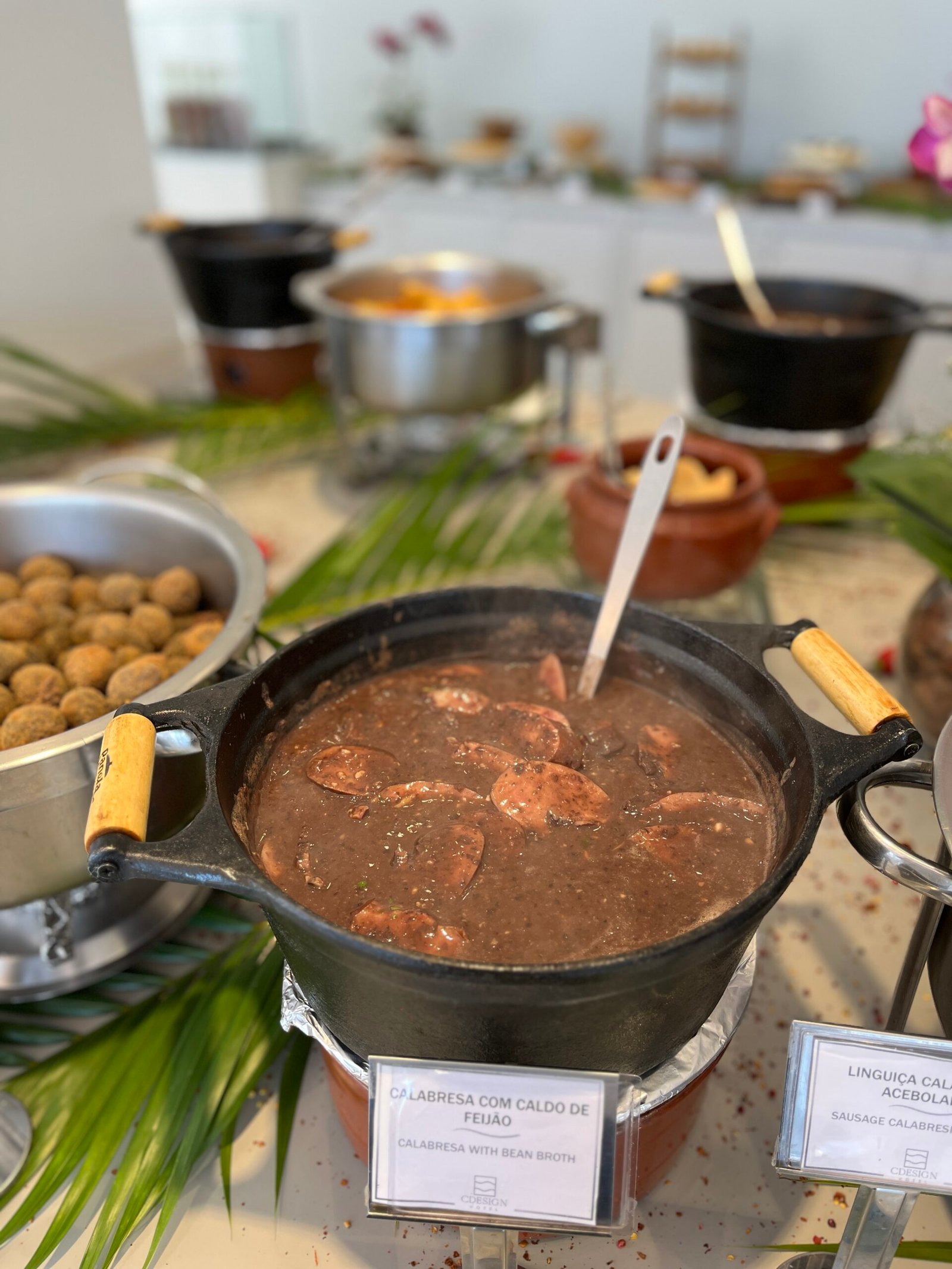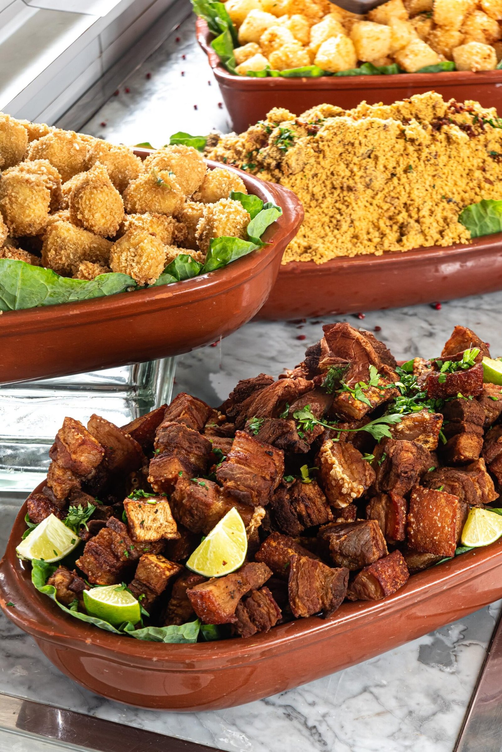 Além disso, acompanhamentos como torresmo, farofa, couve e arroz completam o prato. Antes disso, o público pode aproveitar uma estação de saladas. Por fim, sobremesas variadas encerram a experiência.