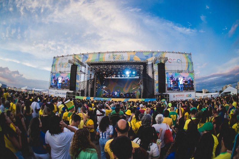 O evento acontece em Niterói, no Caminho Niemeyer, e une transmissão dos jogos da Seleção Brasileira com grandes atrações musicais.