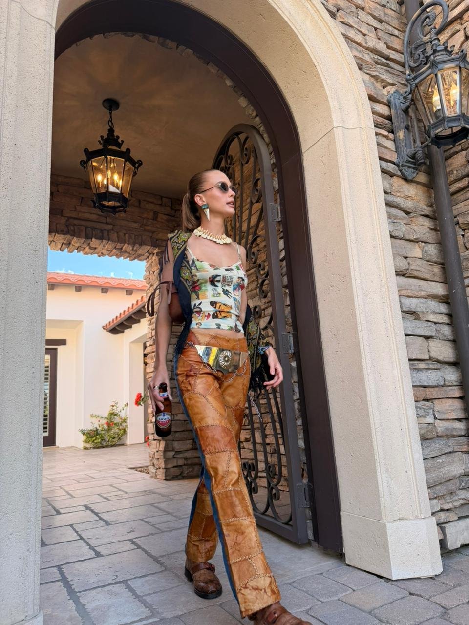 A modelo Maria Klaumann esteve entre os destaques de estilo no Coachella 2026. A brasileira apostou em uma produção 100% garimpada em brechó, com consultoria da stylist Bruna Prado.